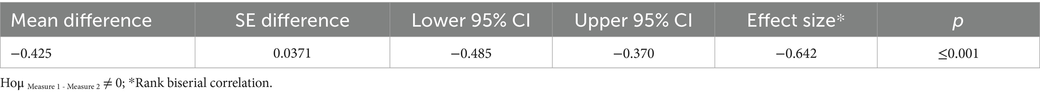 Given the non-normal distribution (W = 0.915, p < 0.001), the Wilcoxon Signed-Rank Test confirmed a significant difference in evaluations (Kerby, 2014) with a significant effect size (Tak and Ercan, 2023). These findings (Table 4) suggest that the workshop had not only a statistically significant effect but also a practically meaningful impact on facilitator performance.
