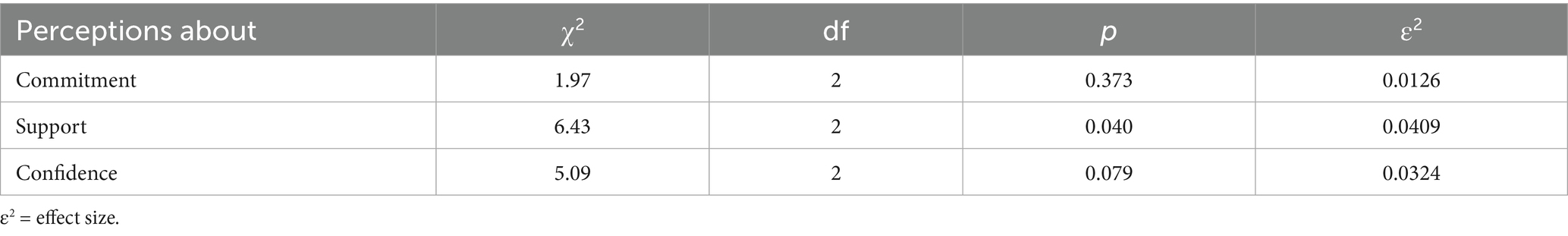 Regarding the correlation with demographics, a Pearson correlation analysis (see Table A1) revealed limited relationships between the survey items and demographics. However, significant associations were found for facilitators teaching real-time virtual classes (VC). A Kruskal-Wallis test (W = 0.755, p < 0.001) revealed that facilitators with 31–100% VC teaching reported stronger perceptions of institutional support (p ≤ 0.05; Table 6), with a small to medium effect size (Saha and Paul, 2023). Figure A1 shows the dispersion of answers to the Likert scale, comparing the answers of three groups of facilitators who teach in VC, 0–10% of their time (N = 72); 11–30% of their time (N = 41); 31–100% of their teaching time (N = 45), over their perception regarding work commitment, institutional support and confidence in the institution.