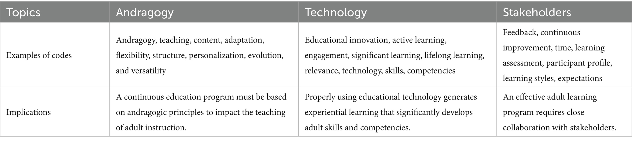 Facilitators reported benefits across various domains, including active learning, engagement strategies, and technology use. However, they also identified shortcomings in applying the final steps of the INSPIRA model, particularly in “Real Challenges” and “Advice.” This limitation may stem from the short duration of CE courses or varying organizational contexts. Other studies have similarly emphasized the importance of tailoring content to the specific needs of adult learners and organizations (Galehdar et al., 2020).