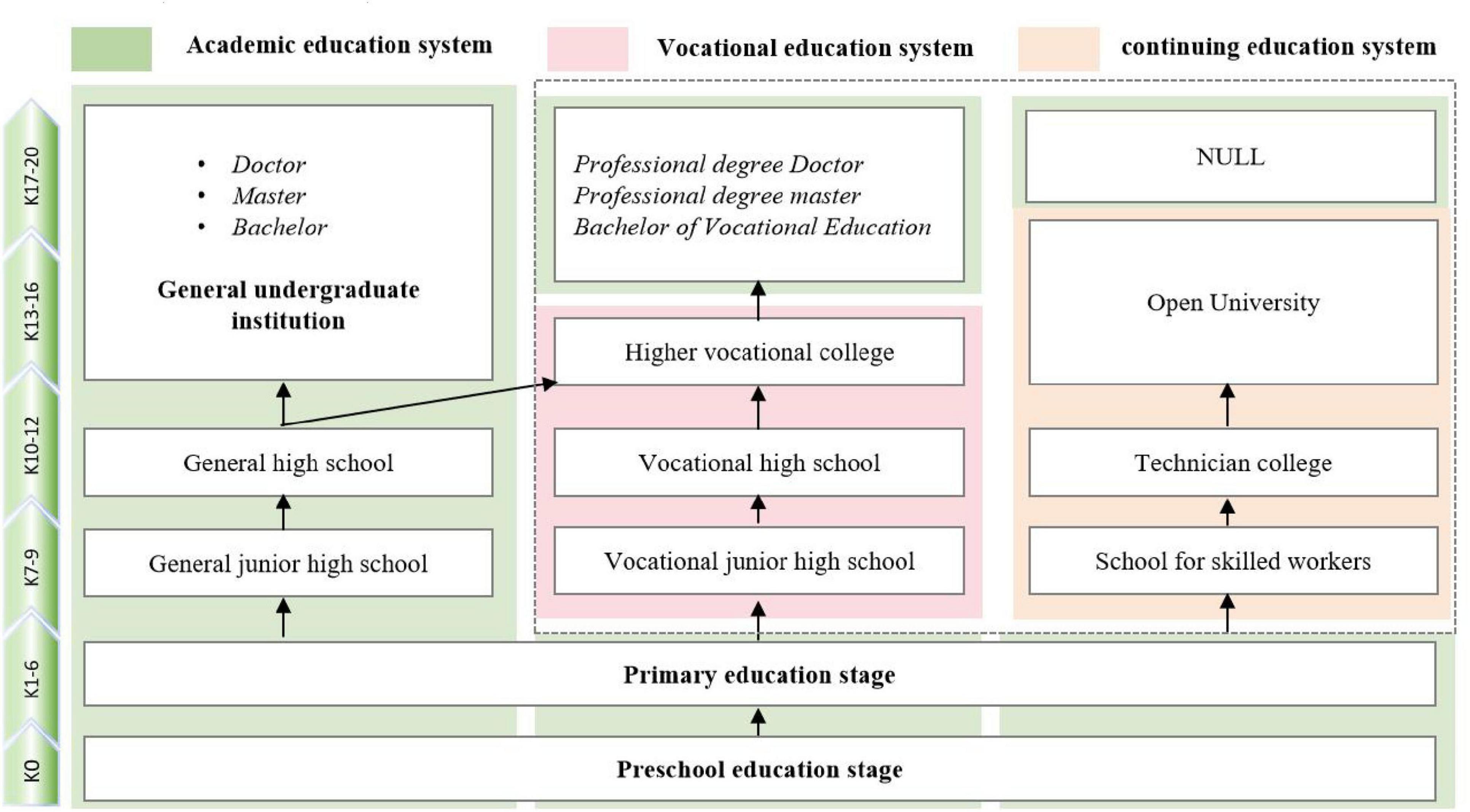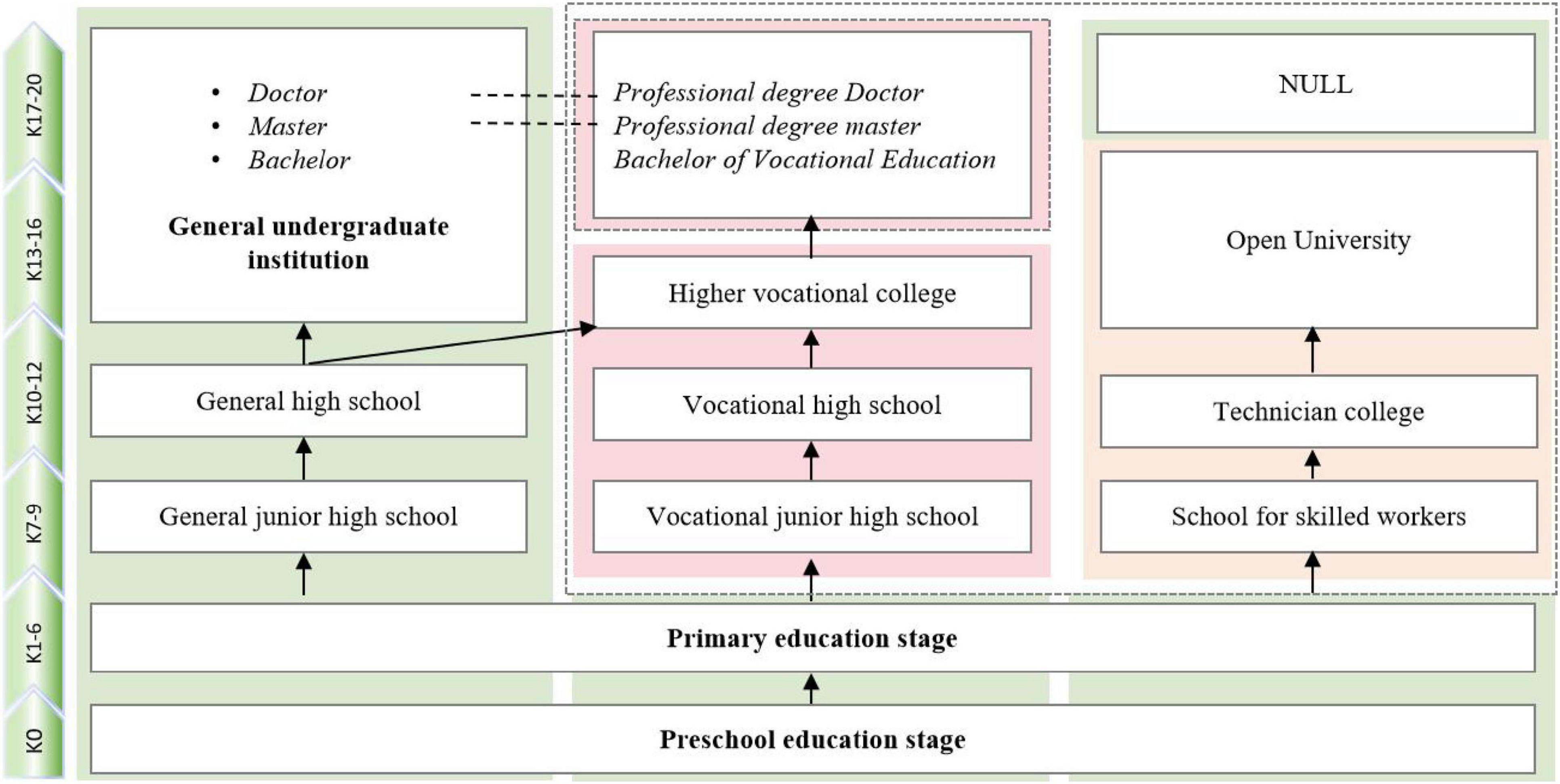 Thanks to the early development of industrialization, Western developed countries took the lead in establishing vocational education systems and forming training systems with their own characteristics. Some countries combine graduation certificates with vocational qualifications. China has also introduced the “1 + X” certificate system based on the experience of other countries, Empowering skills training (Guo et al., 2024). Western countries generally follow K-12 education as the basis, throughout the whole process, and form a professional and systematic vocational skills training path. China, on the other hand, establishes a parallel education system of general education series and vocational education series. After 9 years of compulsory education, it forms a flow of students, forming a long-term training sequence of secondary vocational education (3 years), higher vocational education (3 years), vocational undergraduate education (4 years), professional master’s degree (3 years), and professional doctor (4 years) (Li and Guo, 2022; Zhou et al., 2025). The vocational education system of all countries in the world is basically employment-oriented, and the demand of industry determines the sooner or later vocational education will be distributed (Gupta and Datta, 2023). The diverging orientation and the diverging time of the vocational education system in the developed countries in the world can be divided into four types: “occupation-early diverging,” “occupation-late diverging,” “academically early diverging” and “academically late diverging” (Deng and Zhang, 2024). China’s vocational education belongs to the type of “vocational - early diversion.”