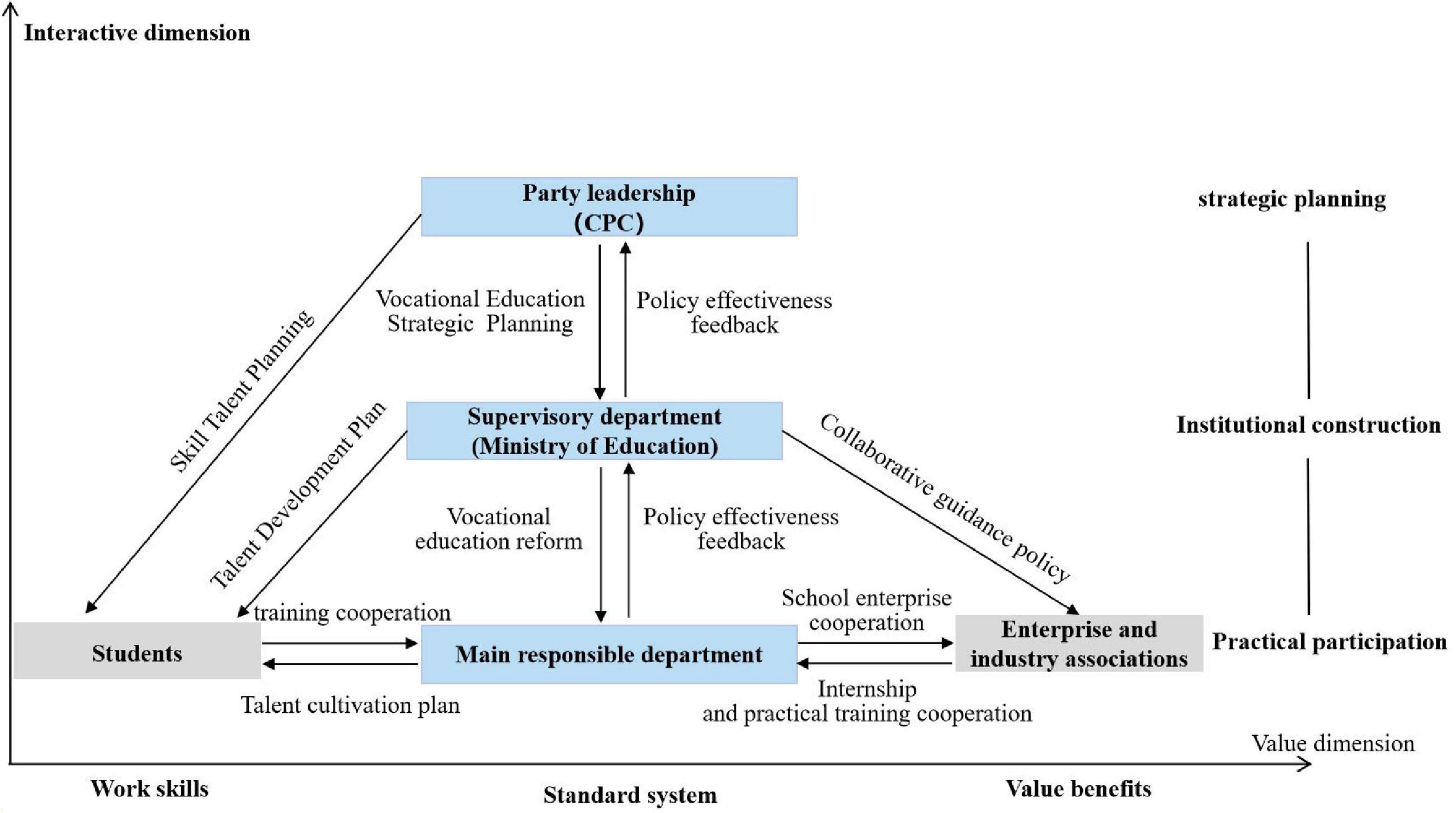 In the construction of vocational education system, which subjects play a role, what responsibilities they undertake, and how they cooperate with other subjects are the main contents considered in theoretical construction, which can be simply summarized into two dimensions: subject dimension and relationship dimension. In terms of subject dimension, the entities that play an important role include the leadership of the Party (Party organizations), the competent department (Ministry of Education), the main responsible department (schools including teachers), enterprises and industry associations, and students. In terms of relationship dimension, the most crucial aspects are planning objectives, implementing standards, and exploring patterns.