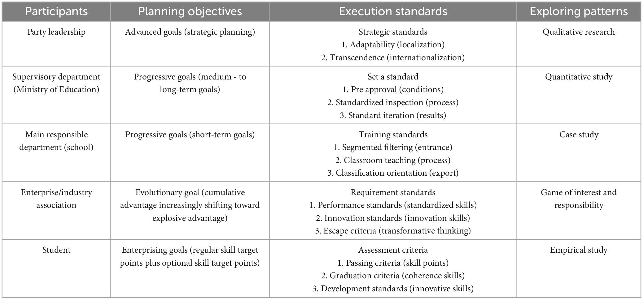 (1) Publish the plan. In January 2019, the Implementation Plan for National Vocational Education Reform took the lead in planning and promoting the construction of an “industry education integration community” (IEIC), marking the shift of industry education integration thinking from focusing on “positions” to focusing on “talents.” It is the most critical strategic plan for vocational education to break through the “upper limit of vocational education qualifications” and establish “vocational and technical universities.” This strategic plan aims to break through the rigid state of specialization between vocational colleges, enterprises, and technology management departments, promote the removal of protective barriers, and create a situation of mutual flow of information elements, providing new growth points for technological innovation and talent cultivation (Hardy and Liu, 2022).
