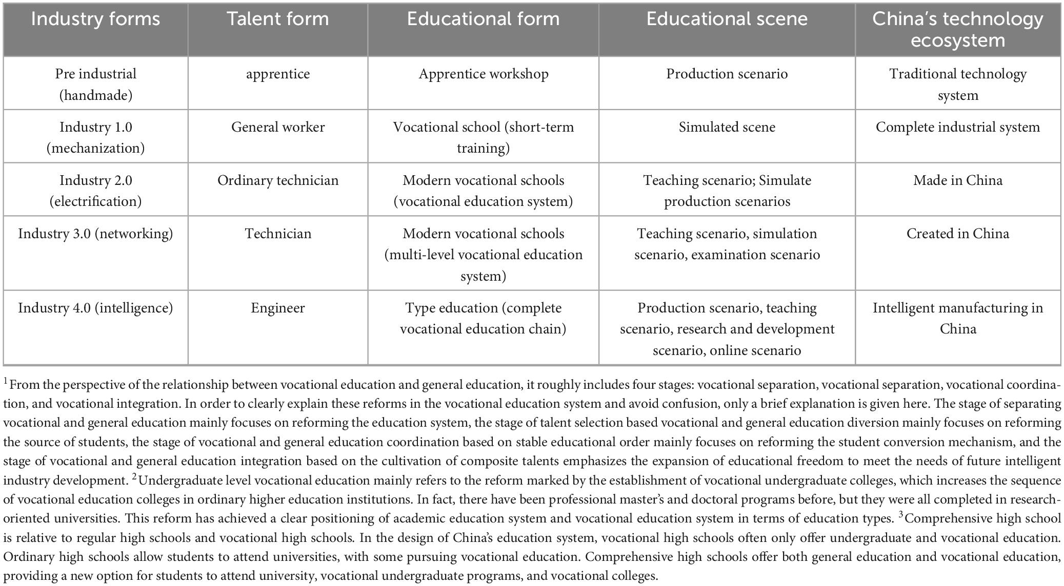 In the third decade of the 21st century, the emergence of intelligent technology has accelerated, and major countries in the world have begun to carry out Industry 4.0 strategic planning. China is an early major country to formulate relevant development plans and actively proposed a new round of industrial transformation and upgrading, striving for the voice of emerging industries. The intelligent industry requires vocational education talents to be engineers, even senior engineers, which requires corresponding reform measures to be taken by the vocational education system. China has also accelerated institutional reforms such as the integration of education, technology, and talent, and the integration of industry and education into a community, in order to meet the needs of industrial transformation (Zhu and Cao, 2024).