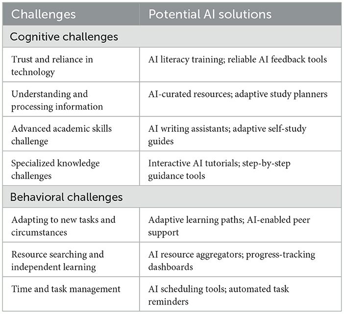 A study exploring the perceptions of students and lecturers at a South African ODL university provided practical insights into ChatGPT's potential for improving cognitive engagement. According to Sevnarayan (2024), students reported that ChatGPT reduced feelings of isolation by offering continuous cognitive support through immediate, personalized interactions, while lecturers acknowledged its capacity to augment teaching effectiveness. The findings underscored ChatGPT's ability to transform perceptions of distance learning by mitigating typical cognitive barriers such as delayed feedback, unclear explanations, and insufficient instructional support. Based on the identified engagement challenges, this study proposes potential AI-assisted solutions informed by participants' experiences and current AI affordances in education (e.g., Zawacki-Richter et al., 2019; Chan and Hu, 2023). Table 1 summarizes these recommendations, which serve as a practical reference rather than an exhaustive solution framework.