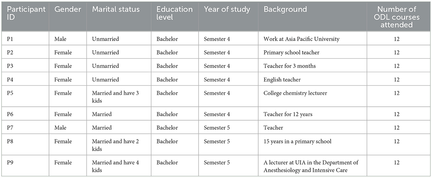 Participants were recruited through an open email invitation sent to all students enrolled in ODL courses, and those who voluntarily agreed to participate were included in the study. This approach reflects a form of voluntary convenience sampling, which is appropriate in qualitative case study research where the aim is to obtain rich, context-specific insights rather than statistical representativeness (Creswell and Clark, 2017; Sandelowski, 2000). While this sampling strategy may introduce certain self-selection bias, the adequacy of the sample was supported by data saturation, which was reached after two focus groups and nine reflective reports, with no new themes emerging. Data were collected through 2 focus groups, each consisting of 4–5 participants. While participants were drawn from a single institution and academic level, efforts were made to include individuals with varying life circumstances, including differences in gender, employment roles (teachers, lecturers, administrative staff), caregiving responsibilities, and digital literacy. These demographic variations introduced a degree of perspective diversity within the scope of a focused qualitative case study. However, future research should expand to include learners across multiple academic levels, institutions, and disciplines to better capture the full range of engagement challenges in ODL environments. The demographics of the focus group participants are summarized in Table 2. Reflective reports were collected from nine participants as part of their final course assignment. These reports required participants to critically reflect on their learning experiences, challenges encountered, and strategies utilized throughout the course duration, thereby providing insightful qualitative data relevant to their cognitive and behavioral engagement. Quantitative behavioral data was obtained directly from the institution's Learning Management System (LMS) through formal cooperation with relevant administrative departments.