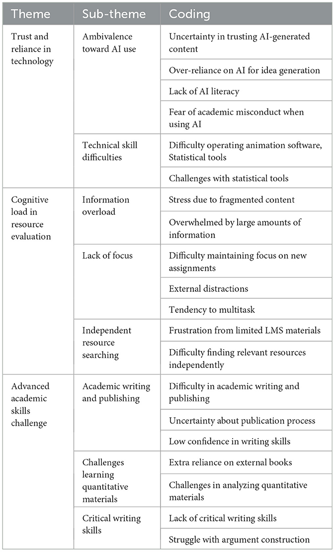 Results: Students reported cognitive challenges such as processing complex content, information overload, and limited academic writing and quantitative skills, alongside behavioral challenges including procrastination, task prioritization, and difficulties with independent learning. Triangulation confirmed these patterns.