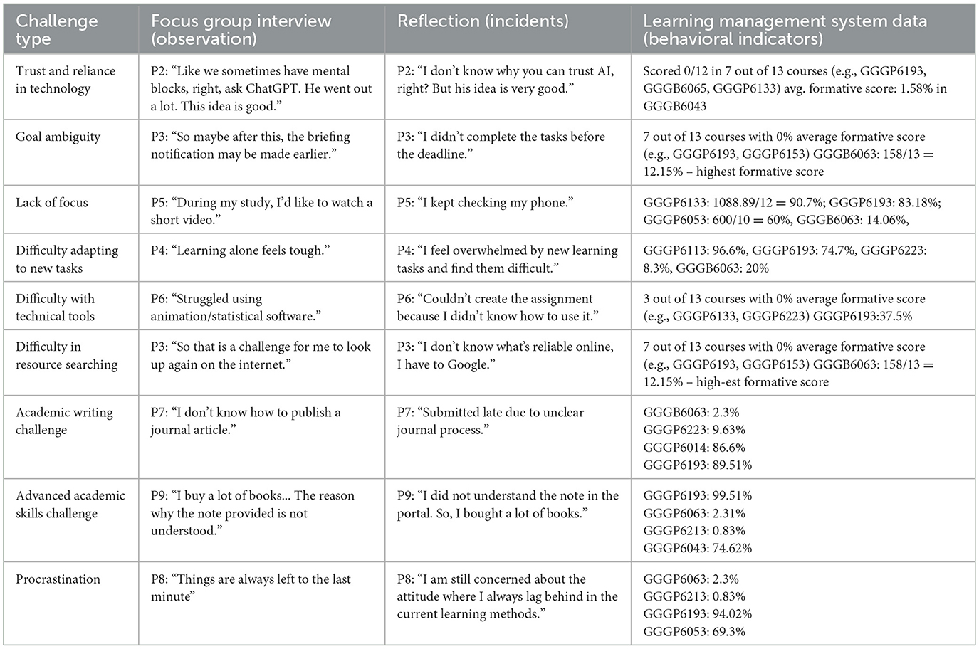 To enhance the trustworthiness and depth of the qualitative findings, this study employed a triangulation strategy, which is commonly used in case study and interpretive research to validate themes across different data sources. Triangulation enables researchers to cross-check the consistency of observed patterns and gain a more comprehensive understanding of complex phenomena. In this study, data were collected through focus group interviews, reflective reports, and Learning Management System (LMS) behavioral data. Each source offers a distinct lens: interviews capture verbalized experiences, reflective reports reveal internal self-perceptions, and LMS data provide observable behavioral evidence. The integration of these sources allows for deeper analysis and enhances the reliability of the thematic conclusions. The convergence of findings across focus group interviews, reflective reports, and LMS behavioral data provides strong evidence of students' cognitive and behavioral engagement challenges, as summarized in Table 5.