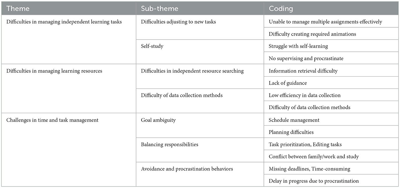 This thematic analysis highlights students' prominent struggles in adapting to new, unfamiliar academic tasks and independent learning environments. The independent nature of ODL requires a high degree of self-regulation and resource management. Students report feeling overwhelmed due to limited experience with specific educational technologies and a lack of clear instructions, thus hindering effective task management and completion. Moreover, independent learning emerges as particularly challenging, revealing a critical need for structured guidance, clearer learning expectations, and supportive resources to enhance student autonomy and confidence in open and distance learning contexts. These insights suggest that targeted interventions to enhance students' ability to self-regulate their learning, such as structured instructional plans, detailed instructional support, and skills-specific training, could significantly improve students' adaptability and independent learning effectiveness.