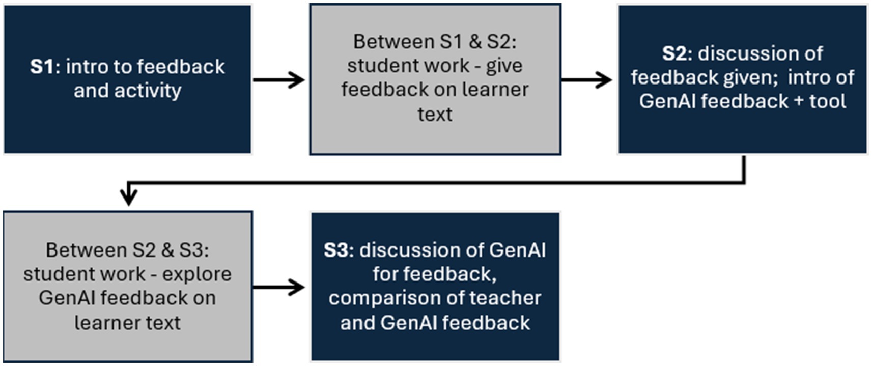 Session 1 should cover the introduction to feedback and then introduce the activity (Implementation section). These key features will serve as a guide for providing feedback on the sample learner text and form the basis for the comparison between the teacher and the AI feedback.