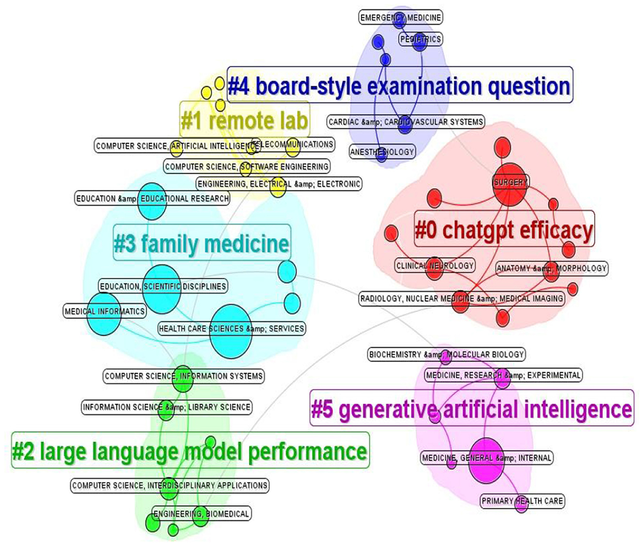 Figure 2 shows the cluster analysis of categories based on title words. This cluster analysis reveals that the main directions included ChatGPT efficacy, remote lab, large language model performance, family medicine, broad-style examination questions, and generative artificial intelligence. These results emphasize the specific directions within the GAI-related medical education space, while also underscoring the importance of collaboration among various directions to propel the field forward.