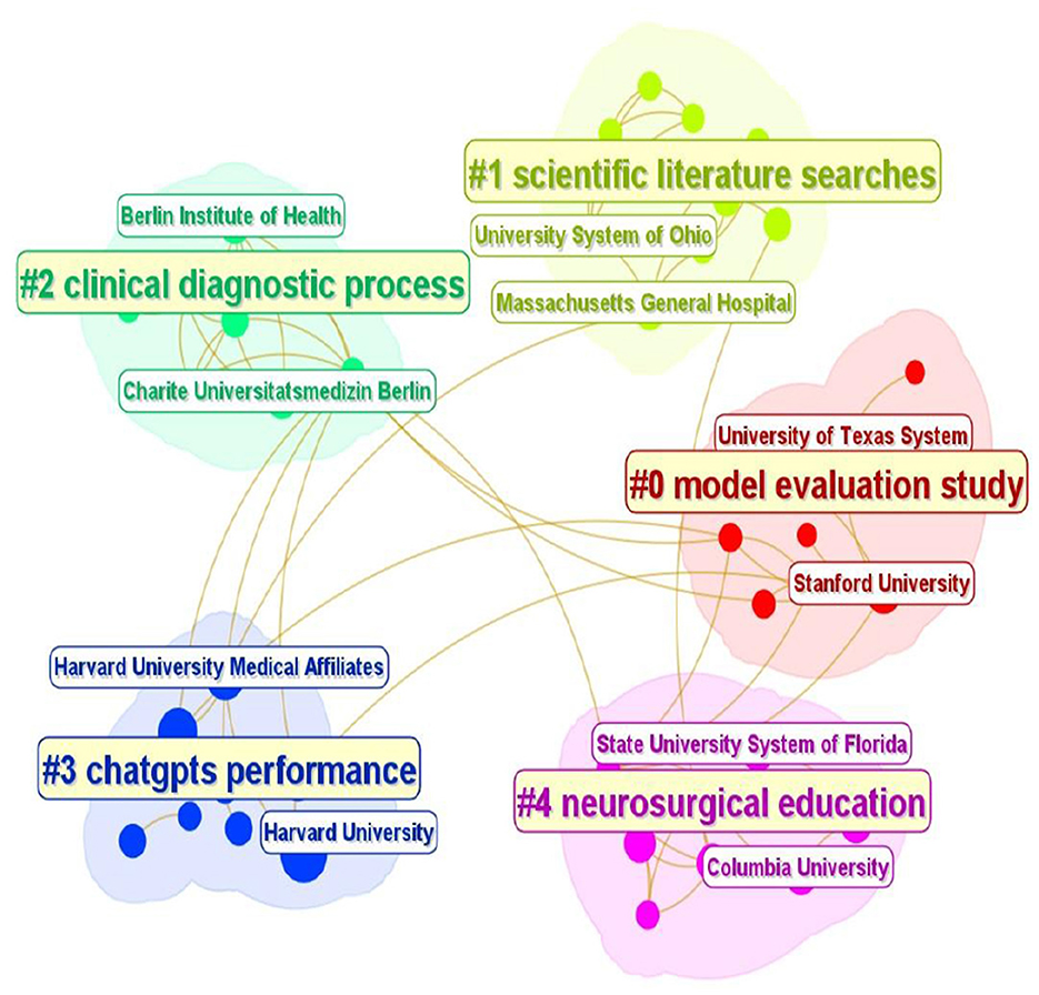 This cluster analysis reveals that the main research directions included model evaluation study, scientific literature searches, clinical diagnostic process, ChatGPT's performance, and neurosurgical education. These results emphasize the expertise of particular institutions in specific directions within the overall GAI-related medical education space, while also underscoring the importance of collaboration among various directions and institutions to propel the field forward.