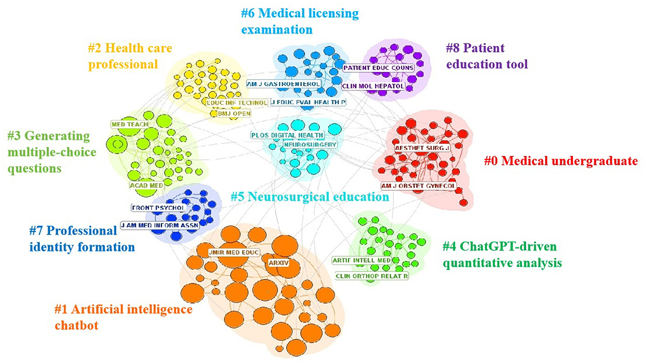 This cluster analysis reveals that the predominant subject categories for these journals include medical undergraduate, artificial intelligence chatbot, health care professional, generating multiple-choice questions, ChatGPT-driven quantitative analysis, neurosurgical education, medical licensing examination, professional identity formation, and patient education tool, highlighting the importance of multidimensional direction for the publication of studies in the GAI-related medical education.
