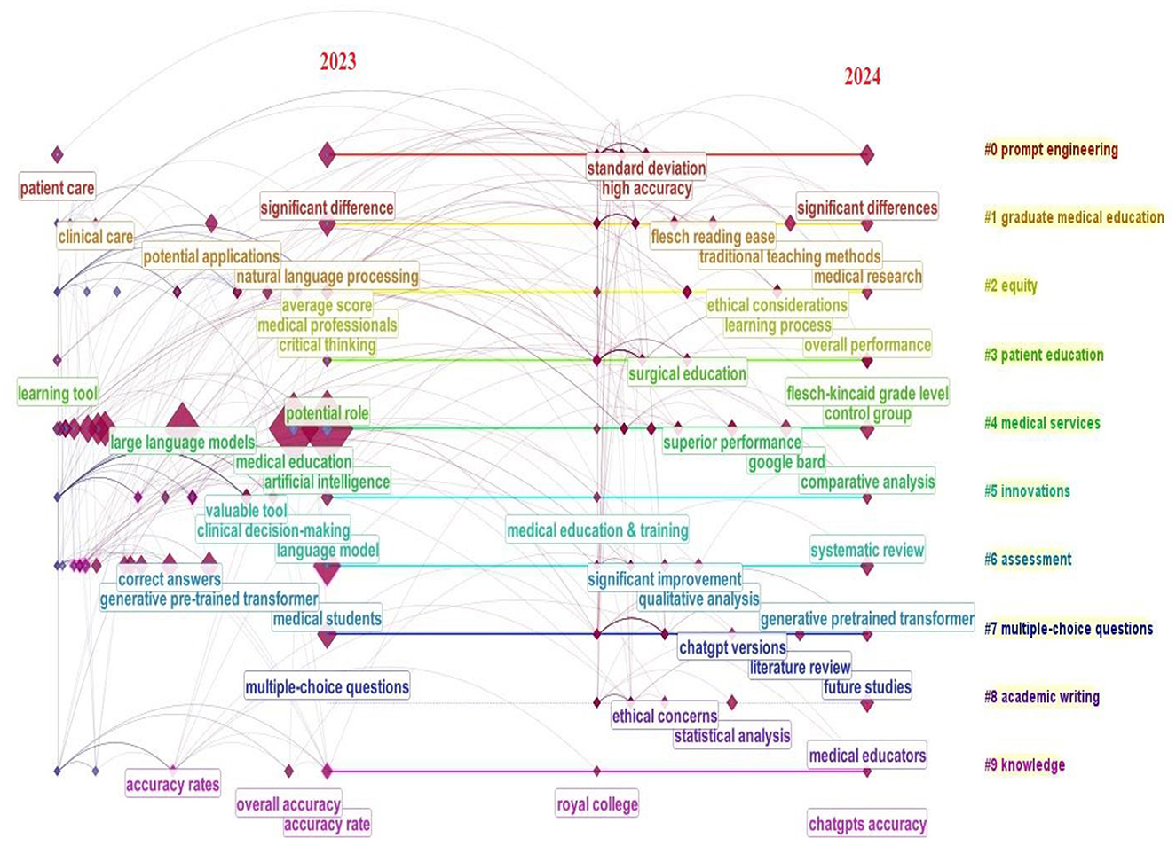 Timeline analyses can offer a visual representation of progress pertaining to particular research keywords and themes over time (Chen, 2017; Lu, 2024). Here, the timeline visualization reveals the profound evolution of GAI-related medical education research over the past 2 years (Figure 6).