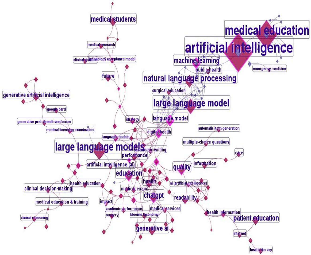 In the generated keyword co-occurrence map, denser, thicker interactions are observed among certain keywords, including “artificial intelligence”, “large language model”, “ChatGPT”, “medical education”, “generative artificial intelligence”, “patient education”, and “natural language processing”, suggesting that these keywords are areas of notable interest within medical education. Furthermore, “machine learning”, “surgical education”, “medical exam”, “medical students”, “medical licensing examination”, “performance”, “health information”, and “public health” are identified as keywords that are closely linked to core keywords.