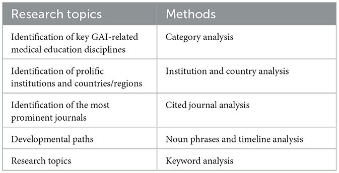 To gain insight into the research trends and focal areas in the GAI-related medical education, a bibliometric analysis is conducted in the article. The methods for different research topics in CiteSpace are shown in Table 1.