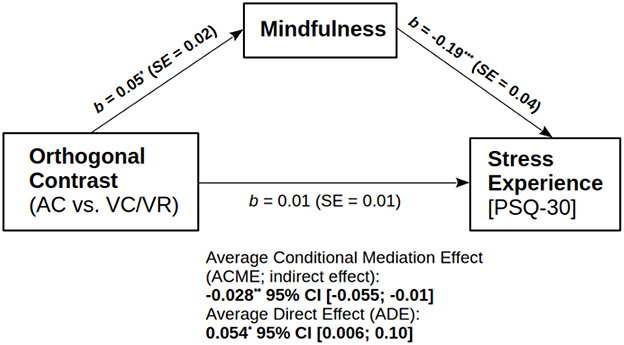 The indirect effect of (post-test) mindfulness (i.e., average causal mediation effects, ACME) on (post-test) stress experience for the path AC vs. VC/VR → mindfulness → stress experiecne was significant [b = −0.03, 95% Boot CI = (−0.055, −0.01), p = 0.012], with a suppressor effect that partially masked the direct effect (i.e., average direct effect, ADE), which became significant in the final model [b = 0.05, 95% Boot CI = (0.007, 0.10), p = 0.027]; see mediational path in Figure 6. However, the ACME for the path including contrast VC vs. VR was not significant [b = 0.004, 95% Boot CI = (−0.027, 0.03), p = 0.81]. Thus, mindfulness mediated but also counteracted the group condition's direct effect on stress. Mediation effects occurred for several remaining outcomes with a similar pattern, yet only regarding the AC vs. VC/VR contrast, especially for the stress scales, self-compassion and self-efficacy, see ST3 (Supplementary material).