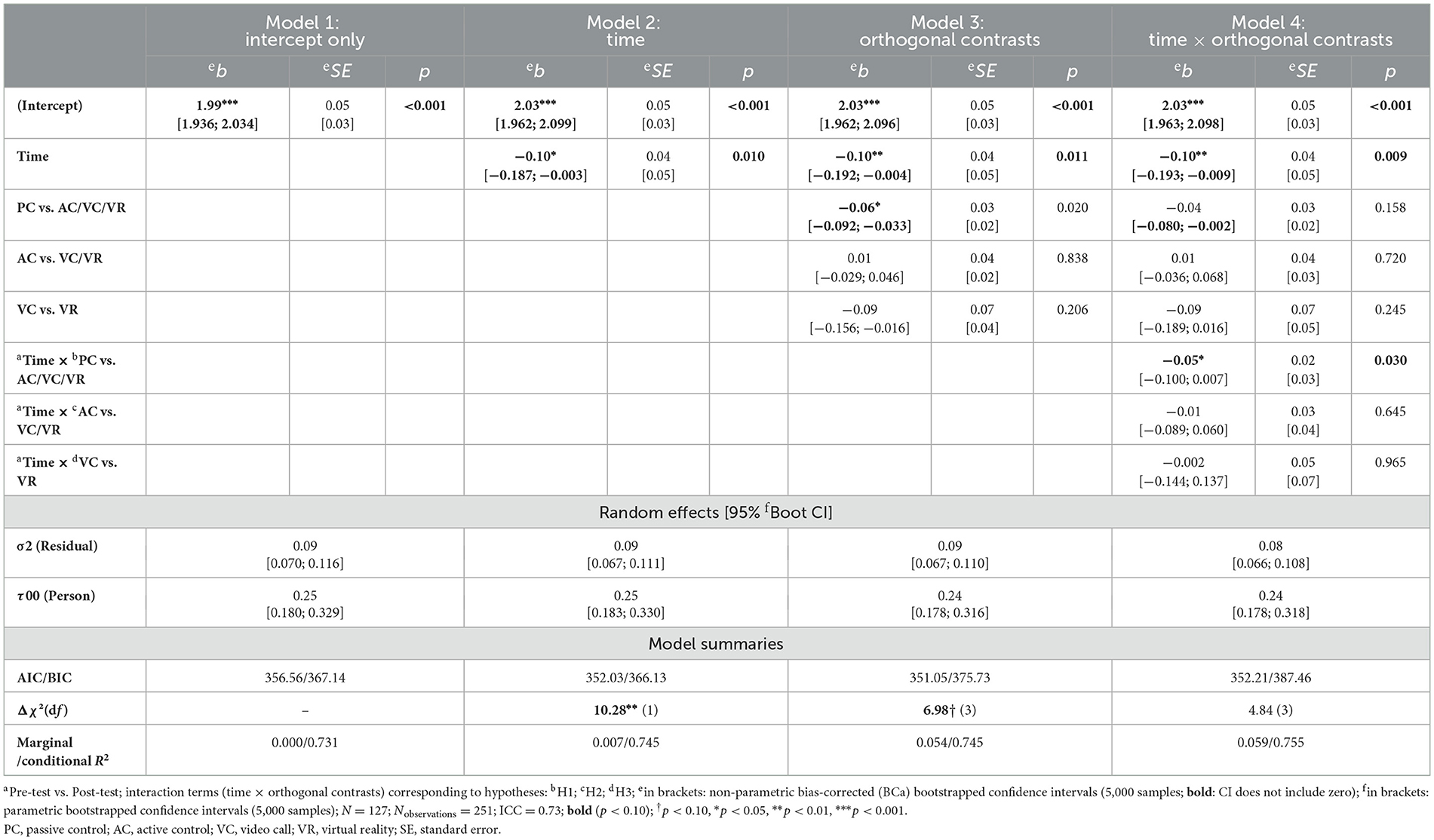 To test our hypotheses, hierarchical Linear Mixed Models (LMM) were conducted with subjects as random intercepts. Model 1 included intercepts only, while Model 2 added time (pretest vs. post-test, coded 0/1), and Model 3 included three orthogonal Helmert contrasts for intervention conditions: (1) PC vs. AC/VC/VR (PC: −3, others: 1); (2) AC vs. VC/VR (AC: −2, others: 1); and (3) VC vs. VR (VC: −1, VR: 1). These unscaled contrasts reflect the stepwise structure of the intervention manipulation. Coefficients are based on raw contrast weights; hypothesis tests remain unaffected by contrast scaling (Cohen et al., 2013). The last saturated Model 4 included the three interaction terms [time × contrast (1), time × contrast (2), and time × contrast (3)] for testing the hypotheses H.1, H.2, and H.3. For model comparison, χ2-Tests were conducted for testing incremental increases in variance explanation.