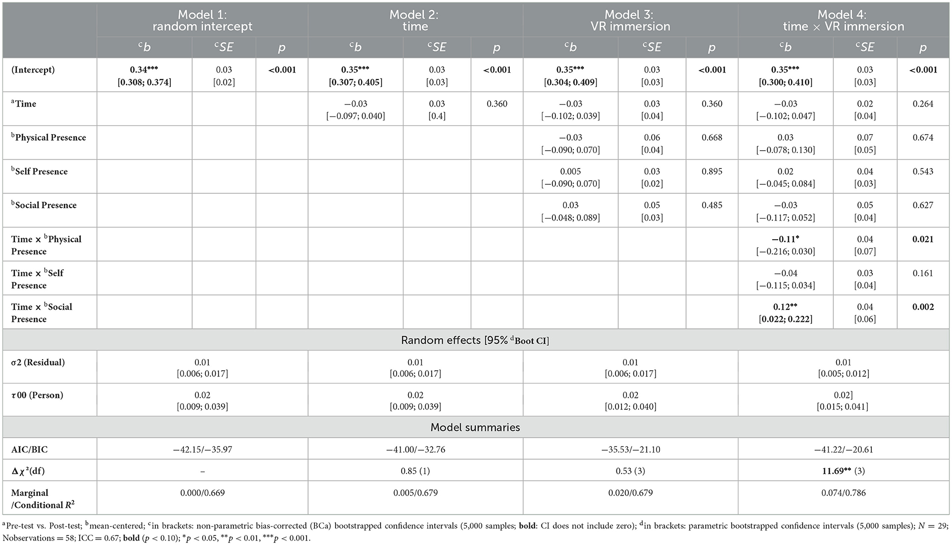 To explore E.2 (correlation of VR immersion with intervention effectiveness), the VR group was analyzed separately to examine relationships between VR immersion and outcomes. VR immersion was assessed globally and across three subscales: physical presence, social presence, and self presence. We constructed the models similarly to those of the hypothesis tests, except that we used the mean-centered VR Immersion scales instead of the orthogonal contrasts.