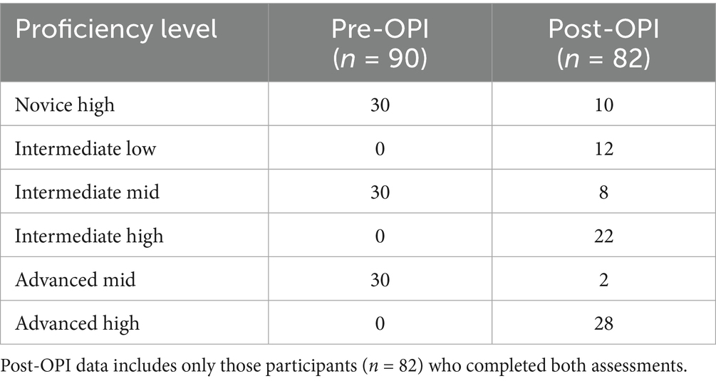 Eighty-two participants completed both the pre- and post-intervention Oral Proficiency Interviews (OPIs). Prior to the intervention, the 90 participants were evenly distributed across three ACTFL proficiency levels: Novice High (n = 30), Intermediate Mid (n = 30), and Advanced Mid (n = 30). Eight participants did not complete the post-intervention OPI.