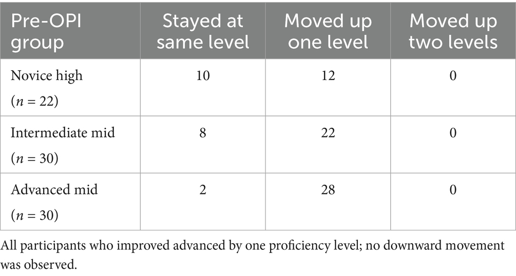Changes in post-intervention proficiency levels are presented in Table 1. Several participants advanced beyond their initial proficiency level, with no instances of regression observed.