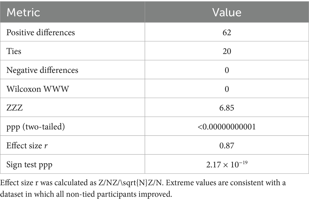 To assess the robustness of the unusually large effect sizes observed, sensitivity analyses were conducted. Bootstrapped confidence intervals with 5,000 resamples were calculated for the Wilcoxon signed-rank effect size. In addition, tied ratings were conservatively recoded as non-improvements to evaluate whether the results remained significant under stricter assumptions. These procedures provided a test of whether the large effect sizes could be attributed to statistical artifacts.