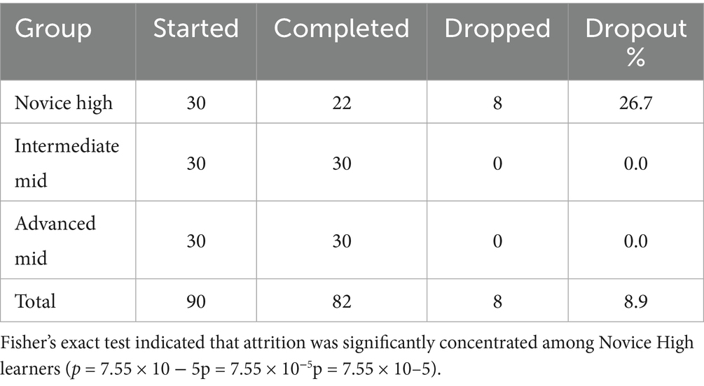Attrition analysis further indicated that of the 90 participants who began the study, 82 completed the post-intervention OPI. Dropouts were not evenly distributed: 8 occurred in the Novice High group, whereas all Intermediate Mid and Advanced Mid learners completed the intervention. A Fisher’s exact test indicated that attrition was significantly concentrated among Novice High participants (p = 7.55 × 10 − 5p = 7.55 \times 10^{−5}p = 7.55 × 10–5). Tables 3, 4 summarize these results.