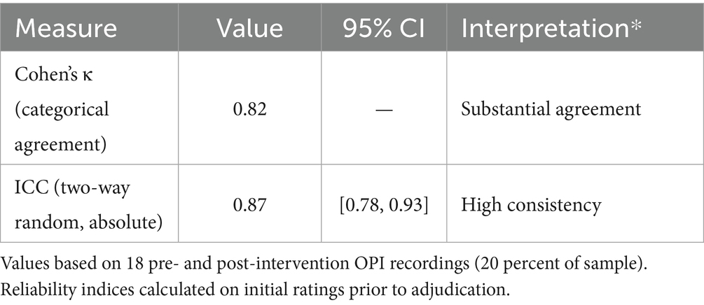 Inter-rater agreement was calculated using Cohen’s κ for categorical proficiency levels and the Intraclass Correlation Coefficient (ICC) for ordinal consistency. Cohen’s κ = 0.82 indicated substantial agreement, while the ICC (two-way random, absolute agreement) was 0.87 with a 95 percent CI of [0.78, 0.93], reflecting high consistency between raters. Discrepancies between raters were discussed and resolved, but reliability indices were calculated on initial ratings to provide an unbiased estimate of agreement.