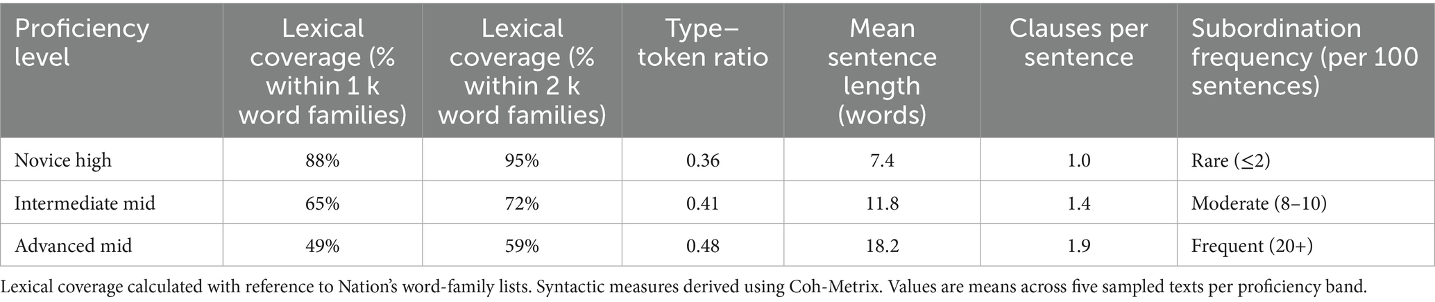Advanced Mid texts exhibited greater lexical diversity (type–token ratio = 0.48) and more complex syntax, with mean sentence length of 18.2 words and frequent use of subordination (20 + instances per 100 sentences). Lexical coverage dropped to 59 percent within the first 2,000 word families, indicating exposure to lower-frequency vocabulary, which aligns with the expectations of advanced proficiency.