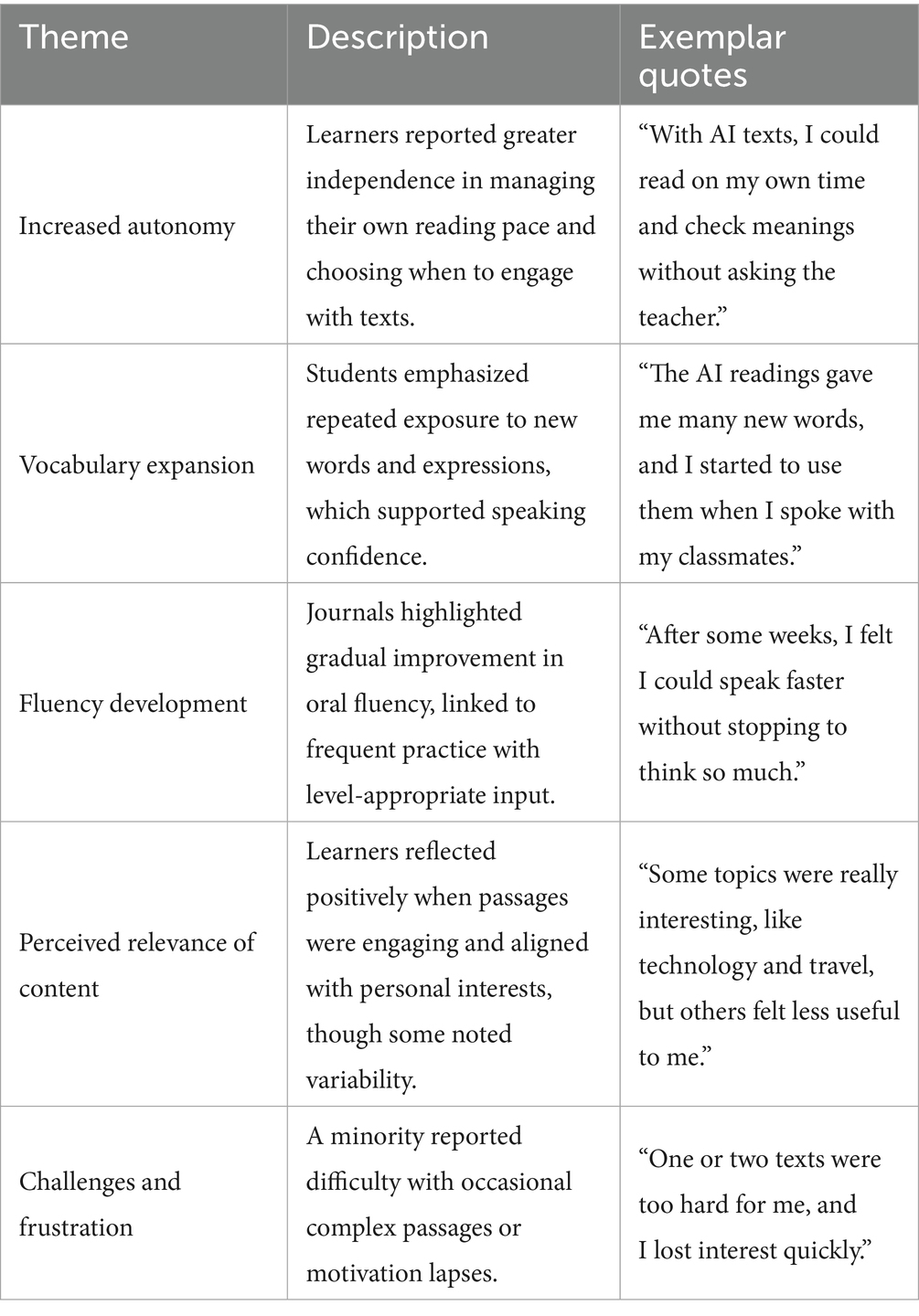 Learner journals were analyzed using thematic analysis (Braun and Clarke, 2006). The process included familiarization with the data, initial coding, theme generation, review, and definition. Two researchers independently coded the journals and compared results to ensure consistency. Discrepancies were discussed until consensus was reached, and themes were refined iteratively. Data saturation was assumed when no new themes emerged. Representative excerpts are presented in Table 1 to illustrate each theme.