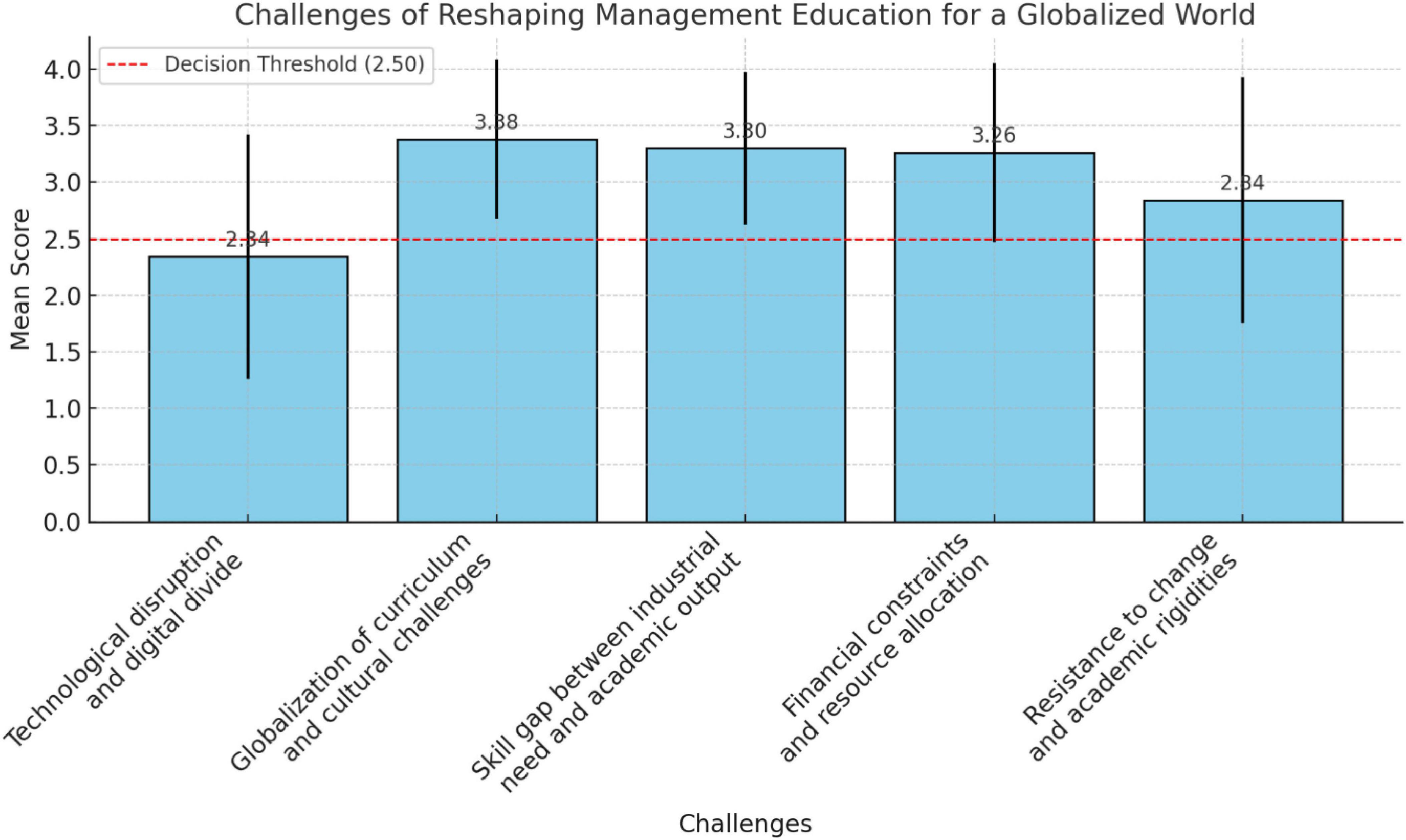 Figure 1 presents the mean scores and standard deviations for various challenges impacting the reshaping of management education for a globalized world. From the bar chart and analysis, the most pressing challenges in reshaping management education are curriculum globalization, the skill gap, and funding/resource constraints. These findings emphasize the need for curriculum reform, industry-academia alignment, and investment in higher education. Items with high standard deviations highlight areas of divergent perspectives, warranting further qualitative investigation.