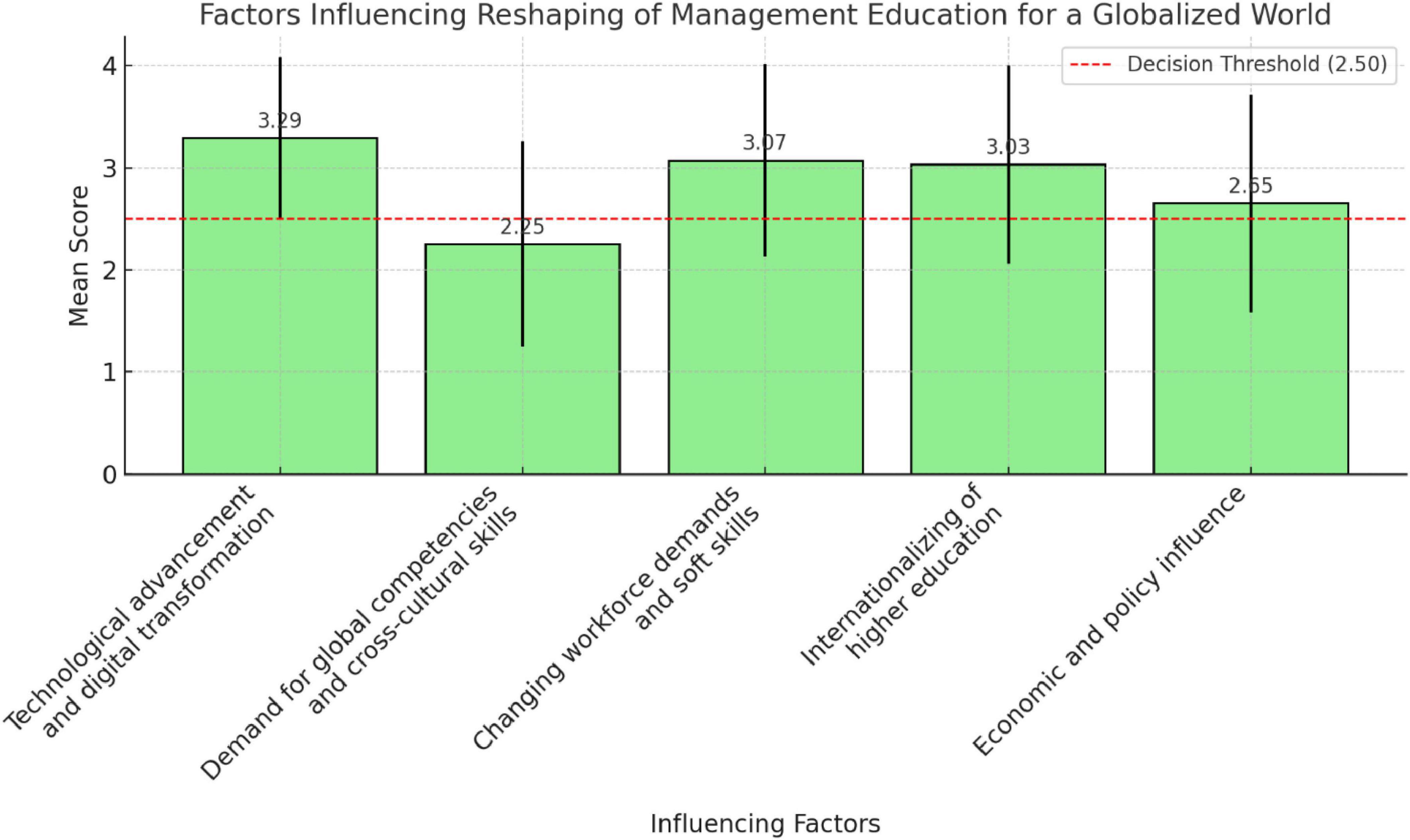 Figure 2, presents the mean scores and standard deviations of the key factors influencing the reshaping of management education in a globalized world. The most significant factor influencing the reshaping of management education is technological advancement, followed closely by workforce trends and the internationalization of education. The rejection of cross-cultural competencies as a key factor—despite being central to globalization—may indicate a gap in awareness or practical implementation in some educational contexts. The high standard deviations across several items point to varying local perceptions and underscore the need for targeted policies that address specific institutional realities.