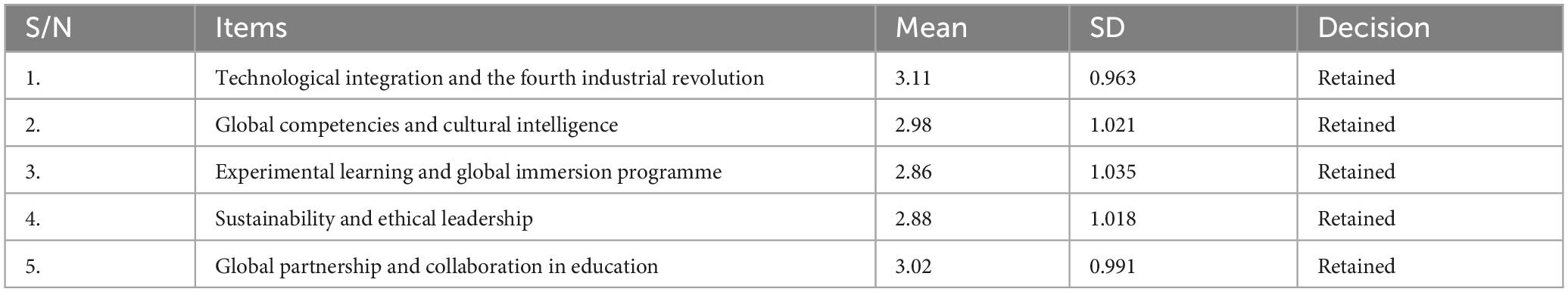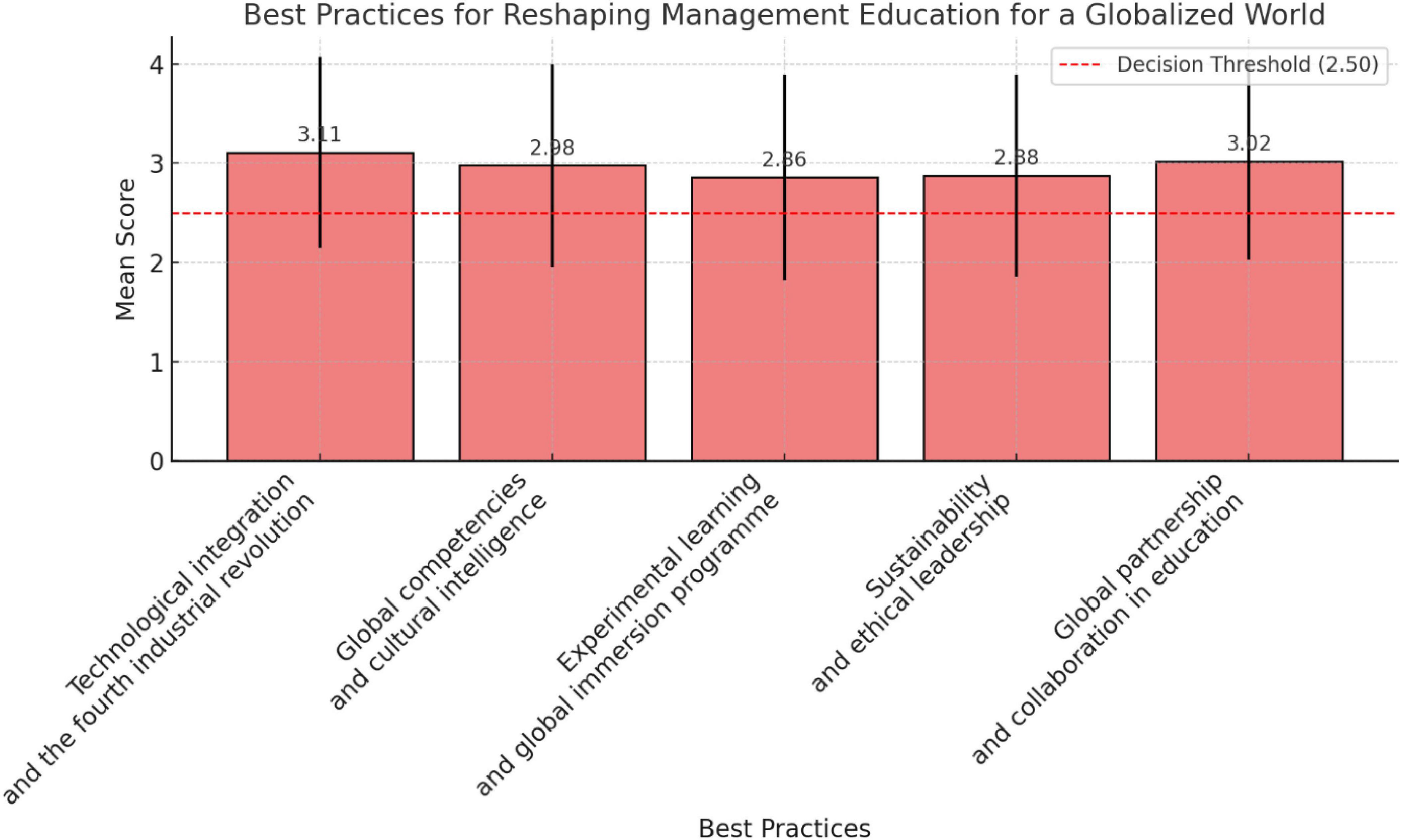 Figure 3 shows the mean scores and standard deviations for best practices identified in reshaping management education for a globalized world. All items were retained, indicating they are perceived as important strategies. All five best practices were retained, indicating that stakeholders recognize the multifaceted strategies needed to align management education with global standards. Technological integration and international collaboration rank highest, while experiential learning and ethical leadership are also recognized as key. The relatively high standard deviations across items signal the need for tailored implementation strategies across diverse educational contexts.