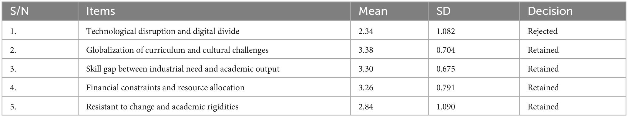 The respondents’ mean scores and standard deviation regarding the challenges encountered in reshaping management education for a global world are displayed in Table 1. The table’s result showed that every item had a high score and was rated higher than 2.50%, demonstrating the participants’ strong agreement with the statement, save for item one where the respondents disagreed with a mean score of 2.34. Additionally, the challenge centered on globalization of curriculum and cultural challenges, the skills gap between industrial needs and academic output, financial constraints and resource allocation, and resistance to change and academic rigidity. The respondents disagreed that technological disruption and digital divide is one of the challenges of management education for a globalized world.