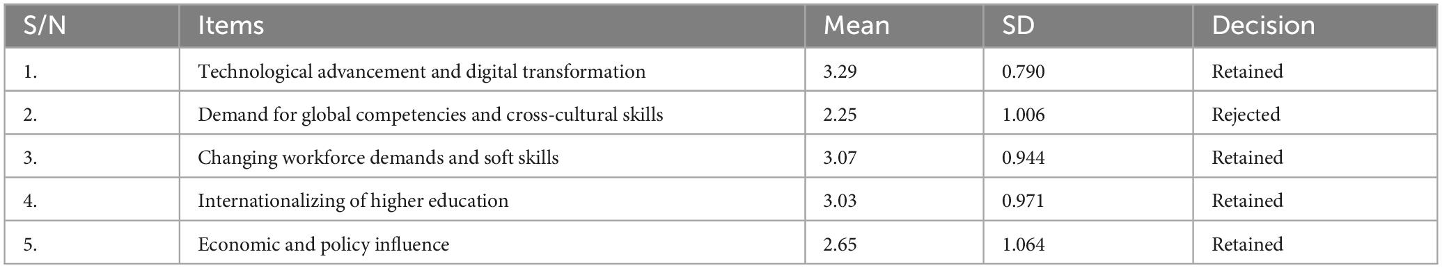 The respondents’ average evaluations of the factors influencing the reshaping of management education for a globalized world were displayed in Table 2. The findings showed that every item had a score higher than 2.50, demonstrating strong agreement with the respondents’ statements and a high management level save for item 2 with score of 2.25, which is lower than the criterion mean of 2.50. Additionally, the respondents strongly acceptable that technological advancement and digital transformation, changing workforce demand and soft skills, internationalization of higher education, and economic and policy influence are a few of these factors. Both the academic and non-academic staff disagreed that demand for global competencies and cross-cultural skills is one of the factors influencing management education in a globalized world.