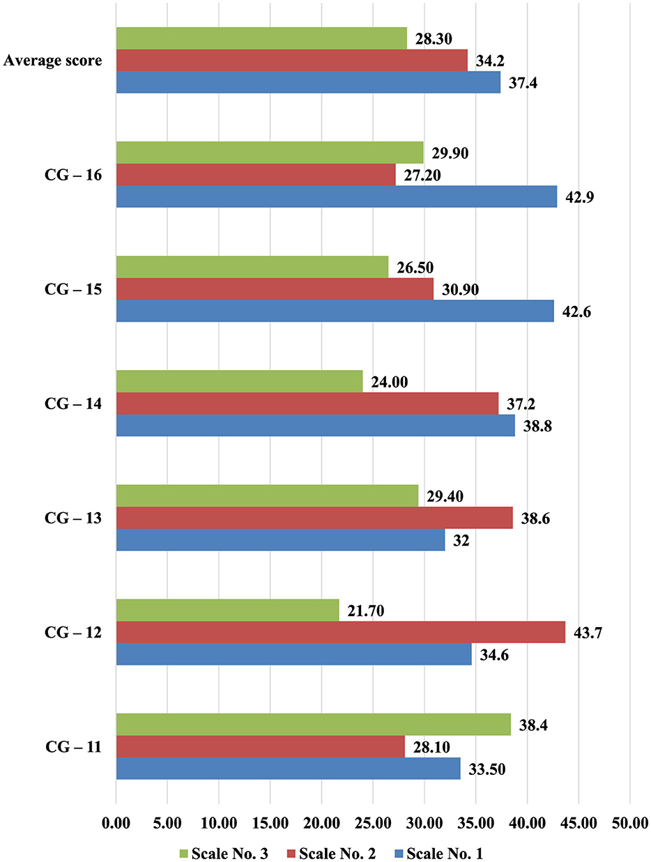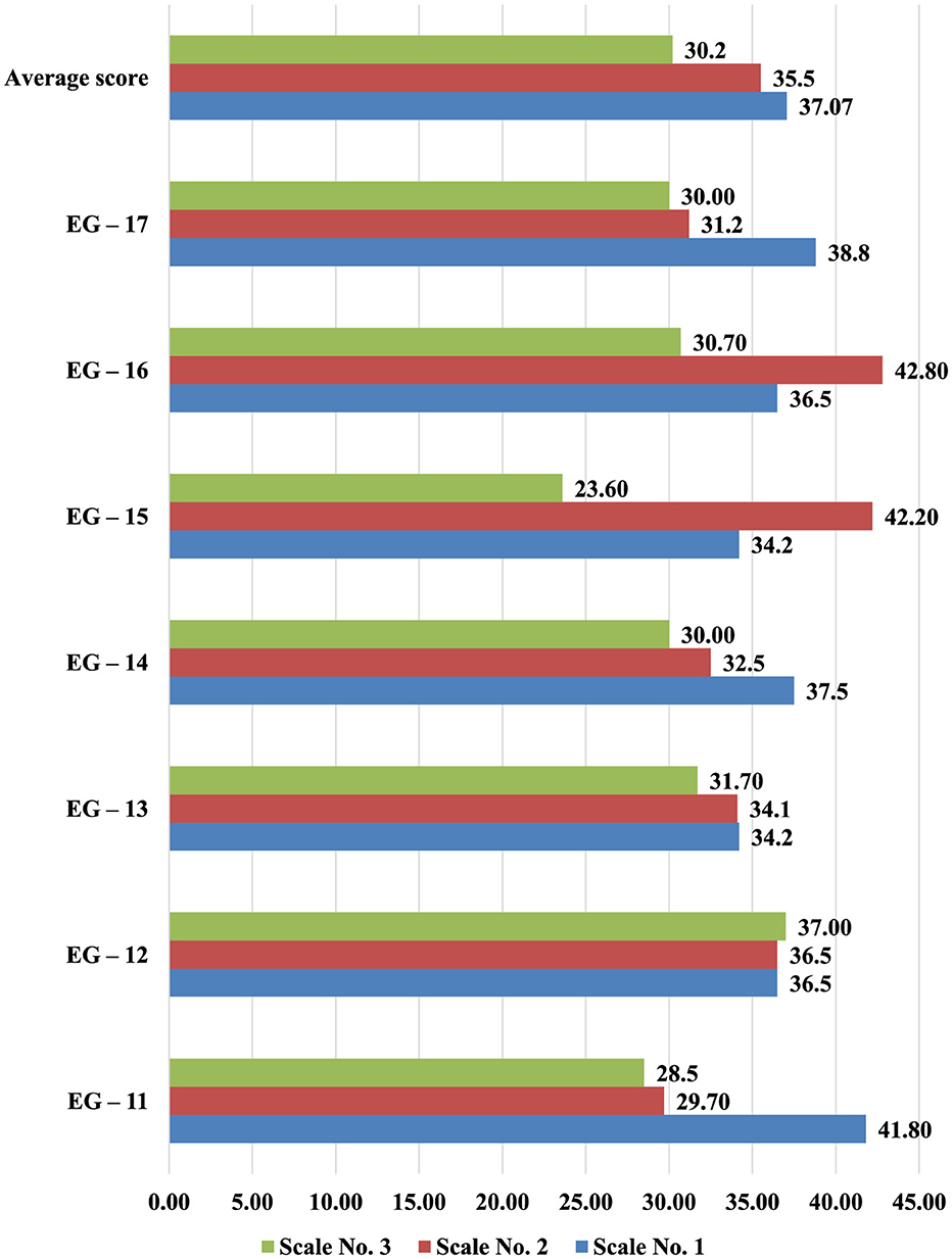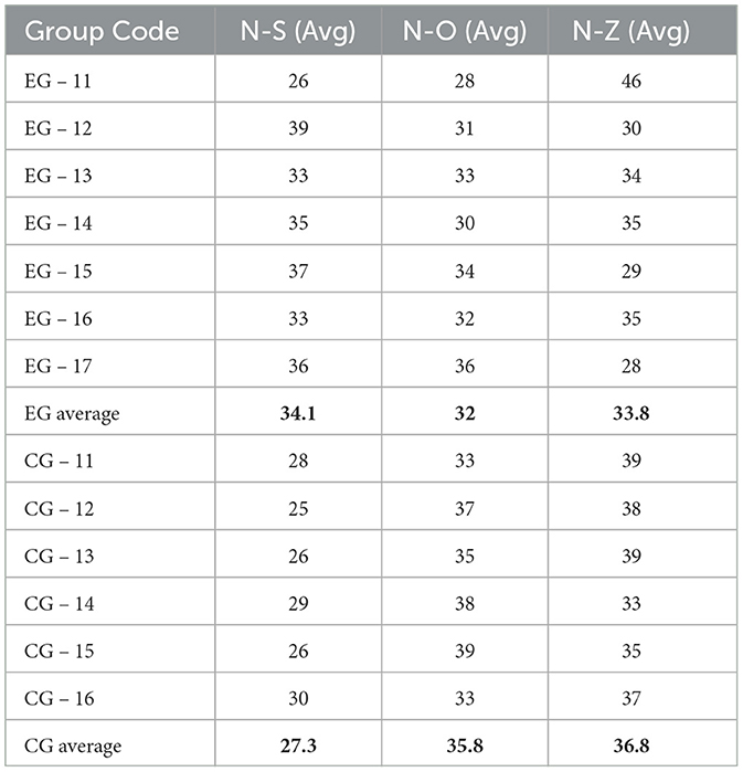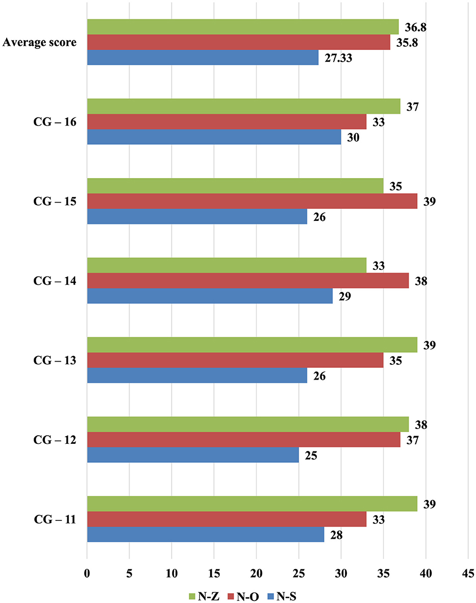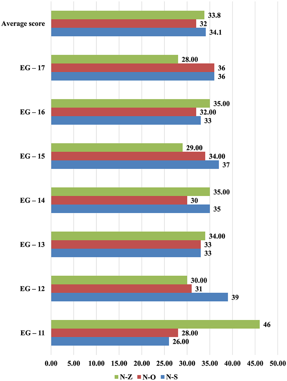 This instrument diagnoses personality orientation by identifying the balance among self-orientation (N-S), communication (N-O), and task-focused behavior (N-Z). Table 4 provides an overview of the average group scores at the entry stage. Researchers labeled each subgroup in the experimental groups (EG) and control groups (CG) according to the codes used during data collection. Figures 1, 2 illustrate these trends graphically. The average scores in the experimental groups (EG) were N S = 34.1, N O = 32, and N Z = 33.8, indicating a relatively balanced approach that combines self-directed attitudes, social engagement, and task orientation. By contrast, the control groups (CG) averaged N S = 27.3, N O = 35.8, and N Z = 36.8, suggesting a stronger emphasis on communication and task focus and lower self-directed orientation. Post-test gains were evident in the experimental group: N-S rose to 37.9 ± 4.9, N-O to 35.5 ± 4.3, and N-Z to 36.2 ± 4.6 (all Wilcoxon Z > 3.1, p < 0.01), whereas the control group showed no meaningful change (see Table 3). The between-group differences yielded moderate effect sizes (e.g., d = 0.57 for N-S), indicating a substantive improvement in self-orientation and overall balance.