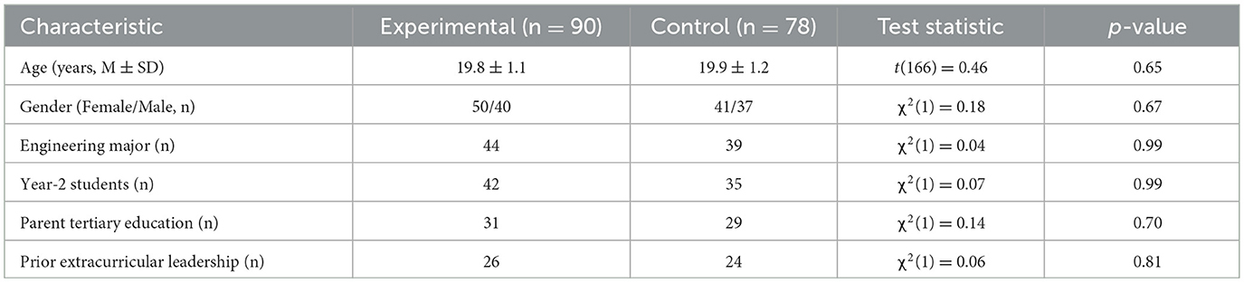 The study involved students from two universities in Kazakhstan. Ninety students from Toraighyrov University were in the experimental groups (coded EG11–EG17), and seventy-eight students from Satpayev University were in the control groups (coded CG11–CG16). Baseline demographic and academic characteristics for both cohorts are summarized in Table 1; independent-samples t-tests and χ2 tests confirmed that no significant differences existed across six key variables (all p > 0.10). Participants were recruited voluntarily after an informational session outlining the study's aims and procedures. Whole-institution (cluster-level) allocation is now standard practice for educational trials where contamination between arms is likely; recent methodological guidance identifies it as an evidence-based safeguard against dilution bias (Hemming and Taljaard, 2023; Dressler et al., 2025). Empirical studies in school and university settings likewise show that cluster designs reduce cross-group diffusion and compensatory rivalry when the intervention is highly visible (Azam et al., 2021; Torgerson, 2001). Site membership was therefore included as a binary covariate in all multivariate models, and effect sizes were unchanged when this covariate was removed, indicating negligible site bias (Baumann et al., 2025).