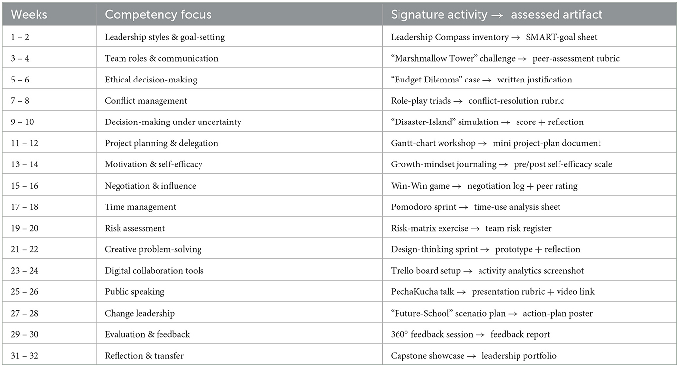 Following the baseline assessment, the experimental group participated in a 32-week structured self-government program, while the control group continued with their standard academic curriculum without any additional intervention. The intervention combined weekly coach-led workshops (90 minutes), team project laboratories, and asynchronous reflective journals (30 minutes per week). Its thematic sequence, signature experiential activities, and assessed artifacts are summarized in Table 2.