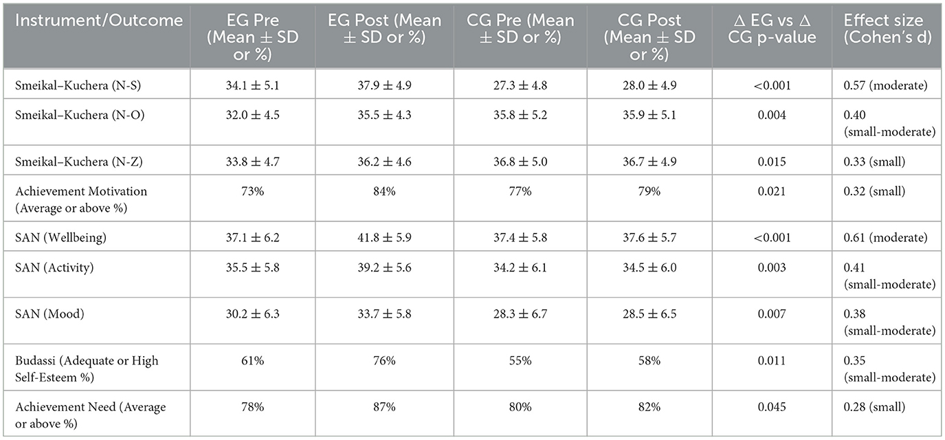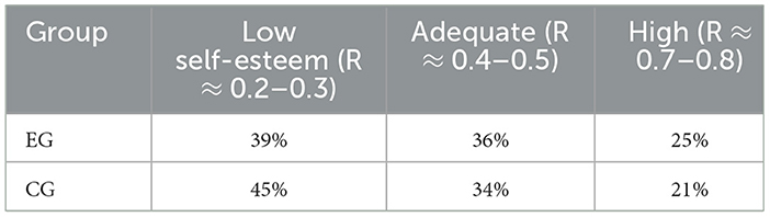 Budassi's method compares each respondent's perception of their qualities to an ideal, calculating Spearman's R from the rank differences. Higher R (around 0.7–0.8) suggests a closer alignment with the ideal, while lower R (0.2–0.3) indicates greater discrepancy with the ideal. Table 8 reports the distributions by group. In the EG, 39% of respondents scored in the low range (R ≈ 0.2–0.3), 36% in the adequate range (R ≈ 0.4–0.5), and 25% in the high range (R ≈ 0.7–0.8f). The CG, however, had a higher proportion of low self-esteem respondents at 45%, with 34% demonstrating adequate levels and 21% falling into the high category. Although both groups contained a substantial number of low–self-esteem individuals, the EG had fewer such cases and slightly more participants with adequate or high self-esteem. The proportion of EG students with adequate or high self-esteem rose from 61 % to 76 % (χ2 = 7.1, p =0.008), compared with a non-significant 55 % to 58 % shift in the CG. The between-group change equates to d = 0.35 (Table 3).