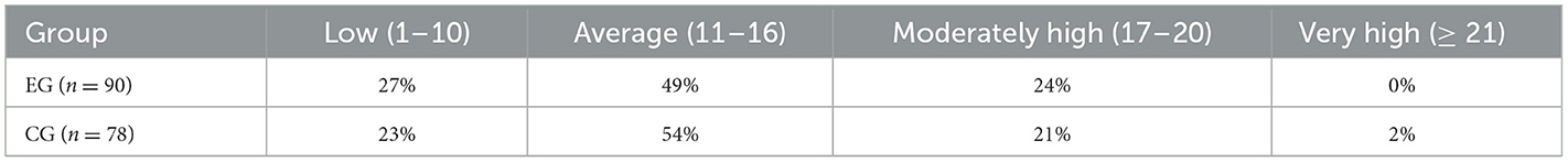 The instrument measures how strongly respondents aspire to succeed, classified into four ranges: low (1–10 points), average (11–16 points), moderately high (17–20 points), and very high (≥ 21 points). Table 5 summarizes the distributions in both groups. In both EG and CG, most respondents reported an “average” level of motivation (11–16 points Among EG respondents, 27% reported low motivation, 49% fell in the average range, 24% were moderately high, and no one reached very high motivation. In the CG, 23% had low motivation, 54% were average, 21% were moderately high, and 2% were very high. While both groups showed a predominance of average motivation, EG participants had a slightly larger moderately high segment, whereas a small fraction of CG students registered very high motivation. After the programme 84 % of EG students fell in the “average or above” band vs. 73 % at entry, a significant shift (χ2 = 6.9, p = 0.009), whereas the CG moved only from 77 % to 79 % (ns). The change comparison (Table 3) corresponds to a small-to-moderate effect (d = 0.32).