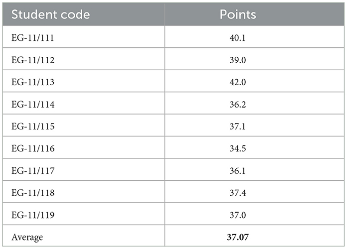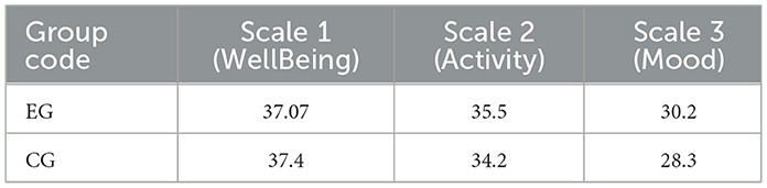This questionnaire measures wellbeing, activity, and mood on three separate scales. Scores from 0–30 are considered low, 30–50 are average, and above 50 are high. Table 6 shows a sample of raw data used to derive the group means, while Table 7 provides the consolidated group averages. Figures 3, 4 illustrate these outcomes. In the EG, the mean scores were approximately 37.07 for wellbeing, 35.5 for activity, and 30.2 for mood, placing all measures within the “average” bracket. In the CG, the mean wellbeing score was about 37.4, with activity and mood averaging 34.2 and 28.3, respectively, suggesting moderate psycho-emotional states. Differences between groups were minor, indicating similar levels of stress and adaptation. Wellbeing, Activity and Mood all improved for the EG (Δ = +4.7, +3.7, +3.5 points respectively; all p < 0.01), yielding effect sizes of d ≈ 0.4–0.6, while CG scores remained stable (Table 3). These results suggest the intervention positively influenced students' psycho-emotional state