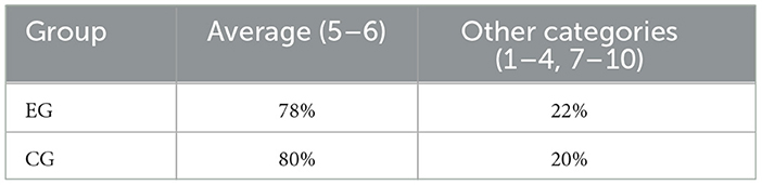 This final instrument evaluates each respondent's intrinsic need for achievement on a 1–10 scale, classed as low (1–2), below average (3–4), average (5–6), above average (7–8), or high (9–10). Table 9 displays the distribution of respondents who fell into the “average” band vs. other categories. In the EG, 78% of students scored in the average range (5–6), and 22% fell in different categories. In the CG, 80% were in the average bracket, leaving 20% in higher or lower ranges. These values suggest that both groups maintain a moderate intrinsic drive to achieve, with no marked advantage for either EG or CG. Average-or-above scores increased to 87 % in the EG vs. 82 % in the CG (χ2 = 4.0, p =.045), a small effect (d = 0.28; Table 3) but consistent with a modest rise in intrinsic achievement drive.
