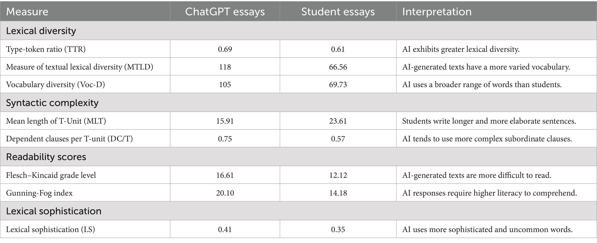 For example, the results indicate increased Type-Token Ratios (TTR) and more complex sentence structures, typically including dependent clauses and higher-level vocabulary (Kalyan et al., 2021). These features characterize the model’s capacity to take huge datasets and generate new combinations of words, thus demonstrating its technical proficiency as a tool for creating language. However, there are some downsides to these features. The excessive utilization of complicated vocabulary and complicated sentence structures tends to detract from the readability of texts composed with the aid of ChatGPT, rendering them less appropriate for academic environments where readability and relevance are paramount. This inclination is in line with Grice’s Cooperative Principle, which calls for a maxim of clarity, relevance, and appropriateness in communication (Grice, 1975). From a theoretical point of view, the verbosity of ChatGPT and its inclination toward complicatedness often violate Grice’s Maxims of Quantity and Relevance. For instance, the use of highly complicated terminology has the potential to confuse readers, thereby undermining the communicative intention of the text (Brennan, 1991). Likewise, in the context of Relevance Theory, the heightened cognitive effort exacted by AI-authored texts can undermine their utility, especially for students learning basic writing competencies (Sperber and Wilson, 1986). By contrast, essays written by students exhibit better readability and communicative relevance. These writings prioritize clarity and coherence, enabling the communication of ideas efficiently without imposing unnecessary cognitive loads on the readers. For instance, while the writing of students may not match the syntactic level of AI-generated texts, it often demonstrates a better sense of audience need and rhetorical intention. This strain between simplicity and complication underscores the value of human-authored texts in academic settings, where the cultivation of critical thinking and clear communication is paramount.