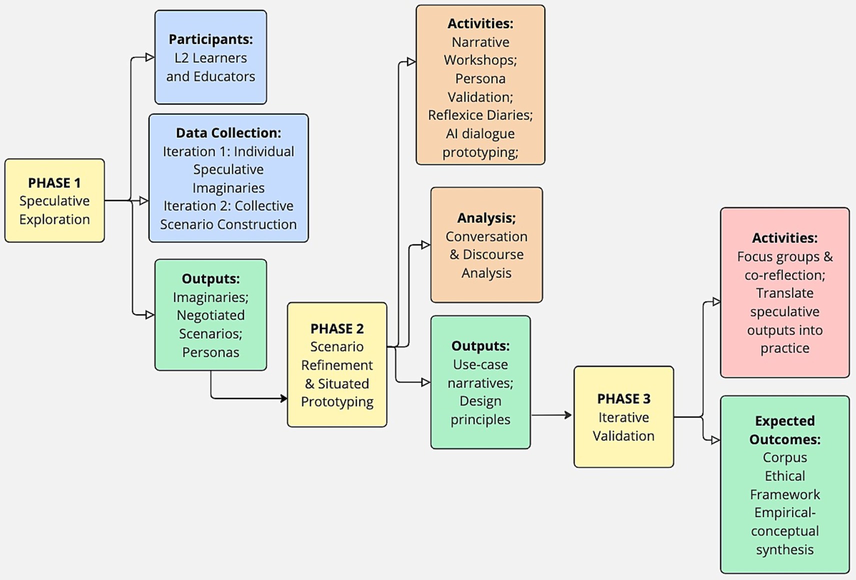 The final phase focuses on validation, theoretical synthesis, and the translation of speculative outputs into transferable design and ethical principles. Findings and design insights will be revisited with in-service teachers through another iteration. Through focus groups and co-reflection, participants reinterpret speculative futures in relation to real classroom contexts, thus closing the loop between imagination and practice. This recursive process transforms speculative exploration into pedagogically actionable knowledge, ensuring that imagined futures inform present educational realities rather than remaining abstract fictions.