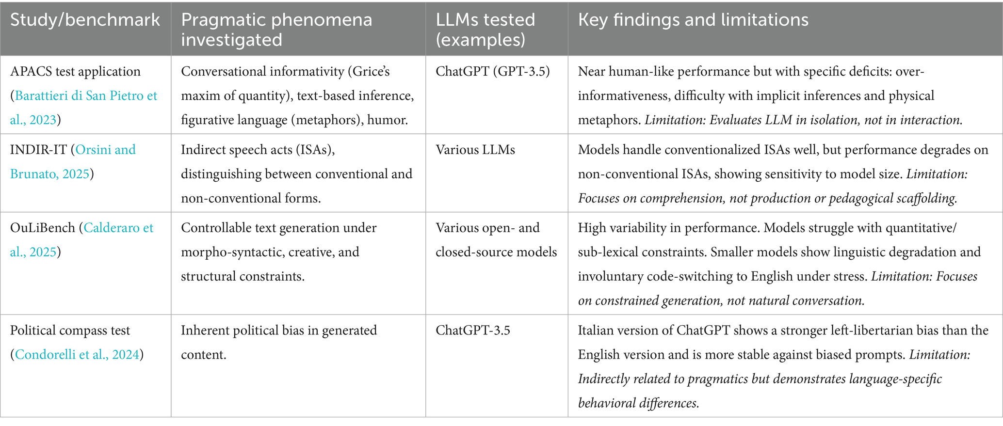 More recent work has focused on developing targeted benchmarks. The INDIR-IT benchmark was created to evaluate LLMs’ understanding of indirect speech acts (ISAs) in Italian (Orsini and Brunato, 2025). Preliminary results show that models handle conventionalized ISAs (e.g., “Can you pass the salt?”) relatively well, but their performance degrades significantly on non-conventionalized forms that require deeper contextual inference. This suggests that the models rely heavily on learned patterns rather than robust pragmatic reasoning (Orsini and Brunato, 2025). Another novel benchmark, OuLiBench, assesses controllable text generation under explicit linguistic constraints (Calderaro et al., 2025). Its findings highlight high variability across models, with many struggling with quantitative and sub-lexical constraints. A particularly revealing finding was the tendency for smaller models to exhibit involuntary code-switching to English when faced with difficult, non-standard tasks, underscoring the powerful influence of the English-dominant training data. Table 1 provides a summary of these key studies.