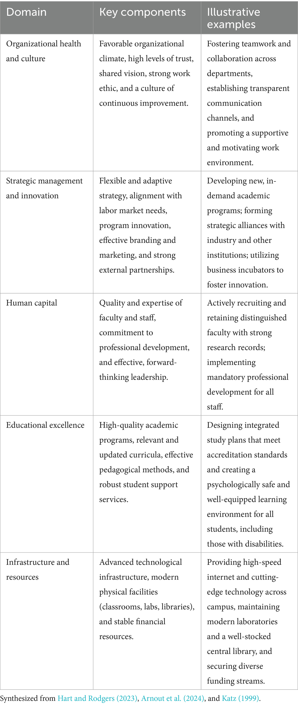 To move the discussion from the theoretical to the concrete, it is helpful to synthesize findings from multiple studies that identify the core components of institutional competitiveness. Research shows that an institution’s competitive capacity is a complex interplay of internal factors—such as resources, human skills, and organizational culture and its ability to position itself within the external environment strategically (Hart and Rodgers, 2023; Zajac et al., 2000; Arnout et al., 2024). A comprehensive view of competitiveness, therefore, must encompass multiple domains, as summarized in Table 1.