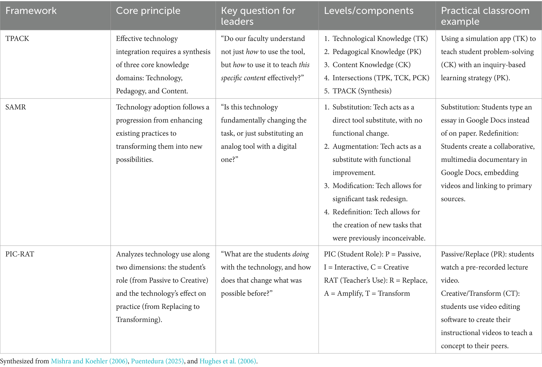 Technology is a powerful tool for enhancing competitiveness, but its implementation is often haphazard. Effective integration must be driven by pedagogical goals, not by the allure of new tools (Schindler et al., 2017; Shalgimbekova et al., 2024). Administrators can use established frameworks to guide planning, evaluation, and professional development. Table 2 provides a comparative guide to three prominent models.