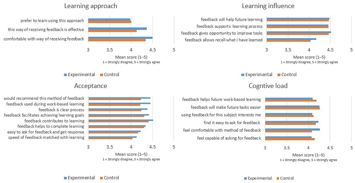 In this section, we discuss the experimental results across four categories: learning approach, cognitive load imposed by simulated automated formative feedback, acceptance of context-aware simulated automated formative feedback, and learning influence.