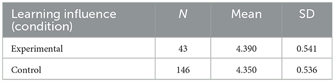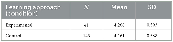 Students evaluated both learning approaches positively, with mean scores exceeding “4” across the three measured dimensions: comfort, effectiveness, and preference (see Figure 1). The experimental group reported a mean score of 4.27 (SD = 0.59), while the control group scored 4.16 (SD = 0.59), as shown in Table 1. Multilevel linear mixed model analyses with group and participant as random effects were performed to test whether students gave a higher rating for the learning approach in the experimental condition compared to the control condition. This was not the case, with F(1, 34.7) = 1.41, p = 0.243 and a small effect size (Cohen's d = 0.18).