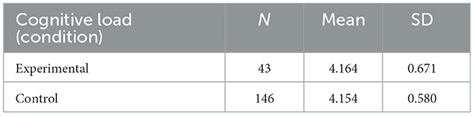 The cognitive load scale aimed to assess the cognitive load experienced by the students. The mean score for the experimental condition was 4.16 (SD = 0.67), while the control condition scored a virtually identical 4.15 (SD = 0.58) (see Figure 1 and Table 2). No differences between the two conditions were found using the linear mixed model: F(1, 38.02) = 0.33, p = 0.569. These findings suggest that the simulated automated support and feedback did not impose additional cognitive load on the students in the experimental condition.