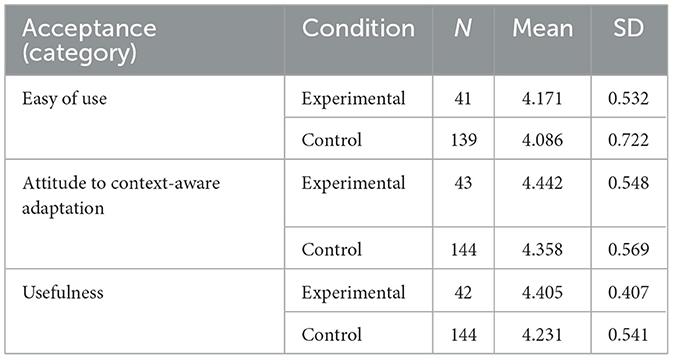 We analyzed acceptance in three categories: ease of use, attitude toward context-aware adaptation, and usefulness. The mean scores are shown in Figure 1 and Table 3. More specifically, the category “ease of use” consists of two items: one assessing “the response speed of the feedback” and the other evaluating “how easy it is to ask for feedback and receive responses.” Students rated both aspects positively, with an average score of 4.17 (SD = 0.53) on a scale of 5. These mean values indicate that participants found the system easy to use. Students also rated context awareness highly. They found that adapted feedback helped them complete learning activities based on their contextual information. Additionally, they agreed that associating feedback with real content contributed to their learning, with an average rating of 4.44 (SD = 0.55).